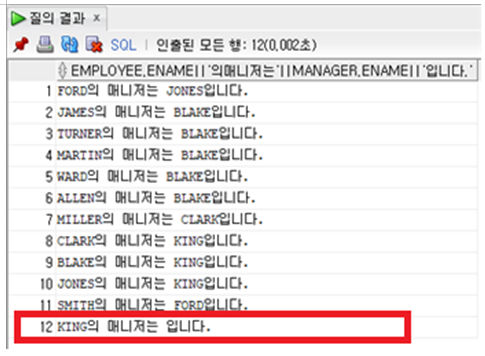 SELECT EMPLOYEE.ENAME||'의 매니저는 '|| MANAGER.ENAME||'입니다.' FROM EMP EMPLOYEE, EMP MANAGER WHERE EMPLOYEE.MGR = MANAGER.EMPNO;