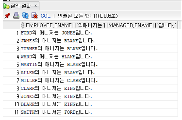 SELECT EMPLOYEE.ENAME||'의 매니저는 '|| MANAGER.ENAME||'입니다.'