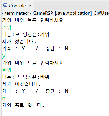 System.out.println("나는:" + getRSPString(this.rsp) + " 당신은:" + getRSPString(player.rsp));