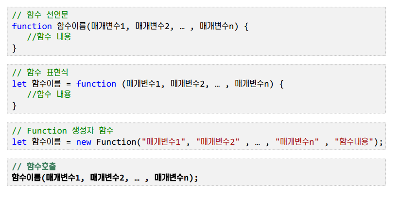 - 각 각 함수 선언문, 함수 표현식 선언과 Function 생성자 함수 호출이다.
