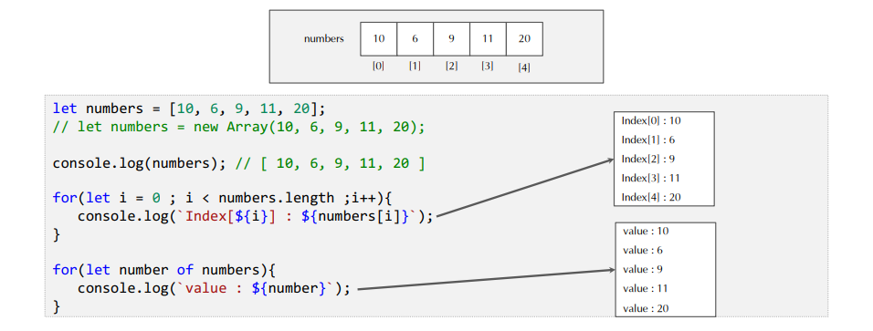 let numbers = [10, 6, 9, 11, 20]; //index는 0번부터 시작하고 index로 배열에 접근