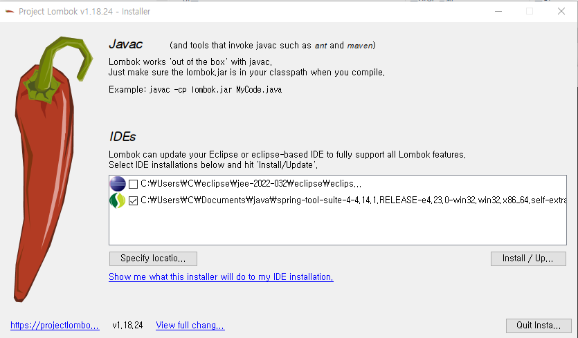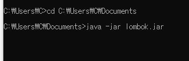 cmd 명령을 실행하면 이런 창이 뜨는데 lombok을 실행코자 하는 IDE를 선택하면 된다.