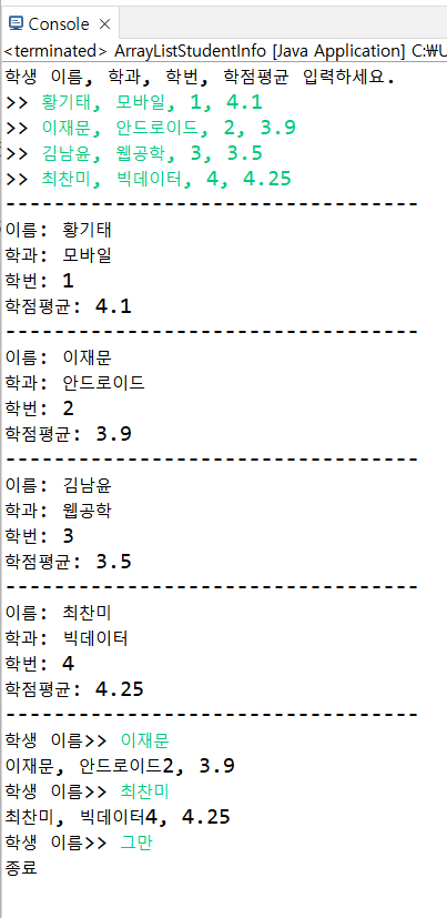 System.out.println("학생 이름, 학과, 학번, 학점평균 입력하세요.");