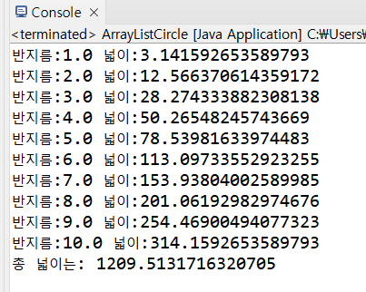 - ArrayList 에 차례대로 반지름이 1인 원 부터 10인원을 입력.
