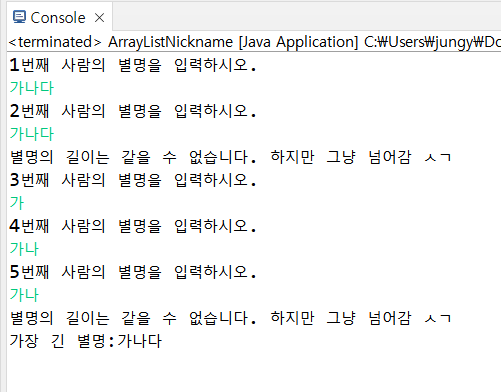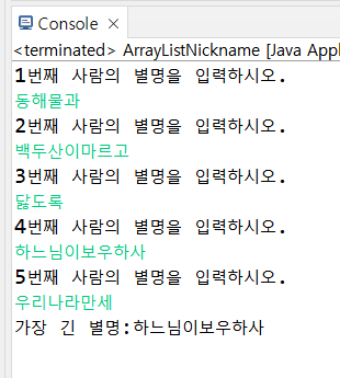 5명의 별명을 입력 받아 ArrayList에 저장하고 이들 중 별명의 길이가